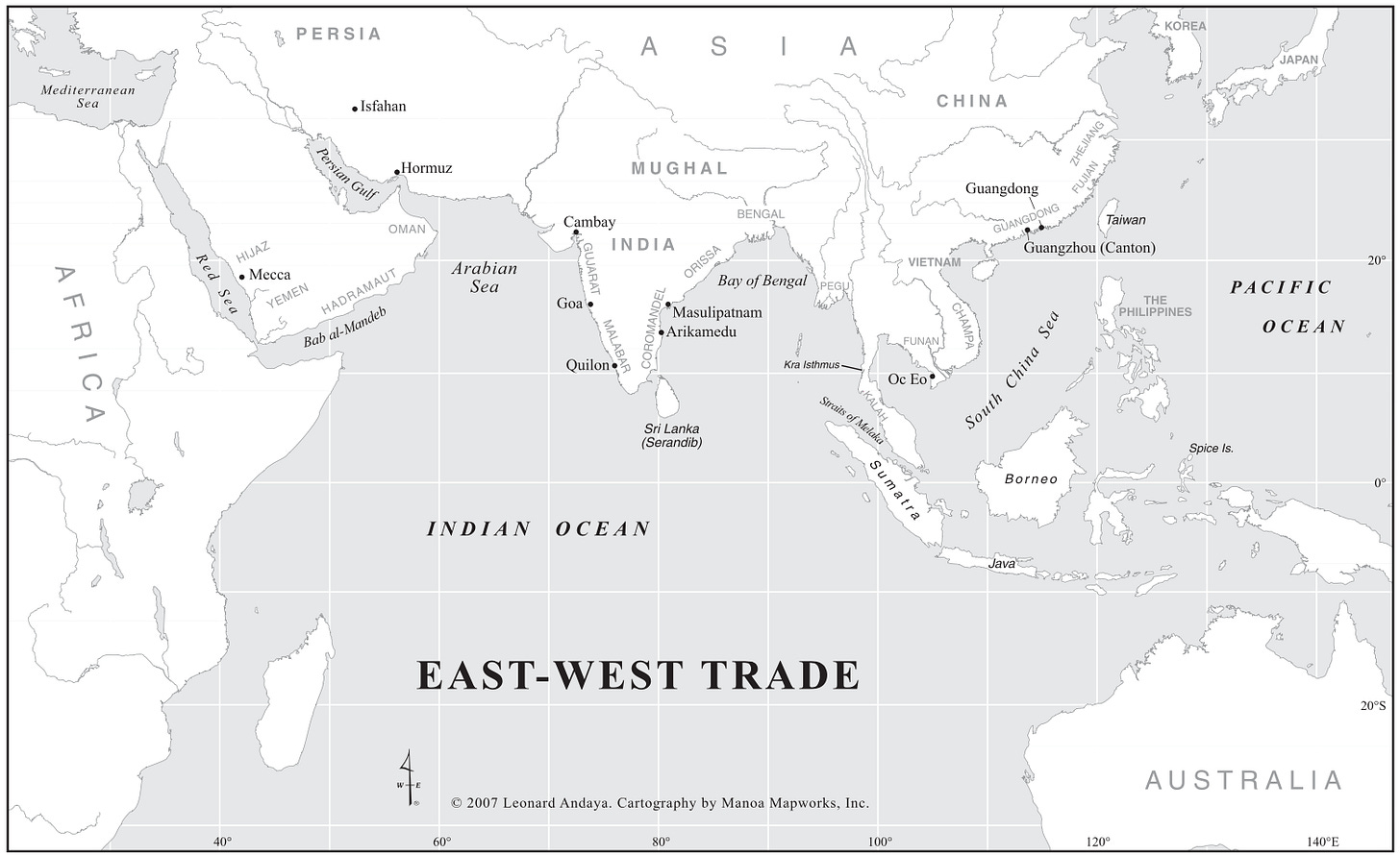 Southeast Asia sprawls across the Indian and Pacific Oceans, and until perhaps the sixteenth century the only known sea passage through the region was the Straits of Melaka. Located midway between the major civilizations to the east and the west, the straits proved an ideal haven for ships because it was protected from the strong monsoon winds by parallel mountain chains along the spines of Sumatra and the Malay Peninsula. It was the âendpointâ of both the northeast monsoons that blew between January and April and brought traders from the east, and the southwest monsoons of July to November, which carried traders from the west. While traders awaited favorable winds to return home, the communities located astride the straits quickly seized the opportunities the situation provided. They established ports for traders to repair their ships, replenish supplies, obtain local products, and exchange goods with merchants from all parts of the world. Furthermore, the interior of both landforms that bordered the straits produced valuable forest products, particularly camphor, benzoin, gaharuwood (eaglewood), and dragonâs blood (a kind of kino)âall of which were highly prized in the international marketplace, particularly in China.