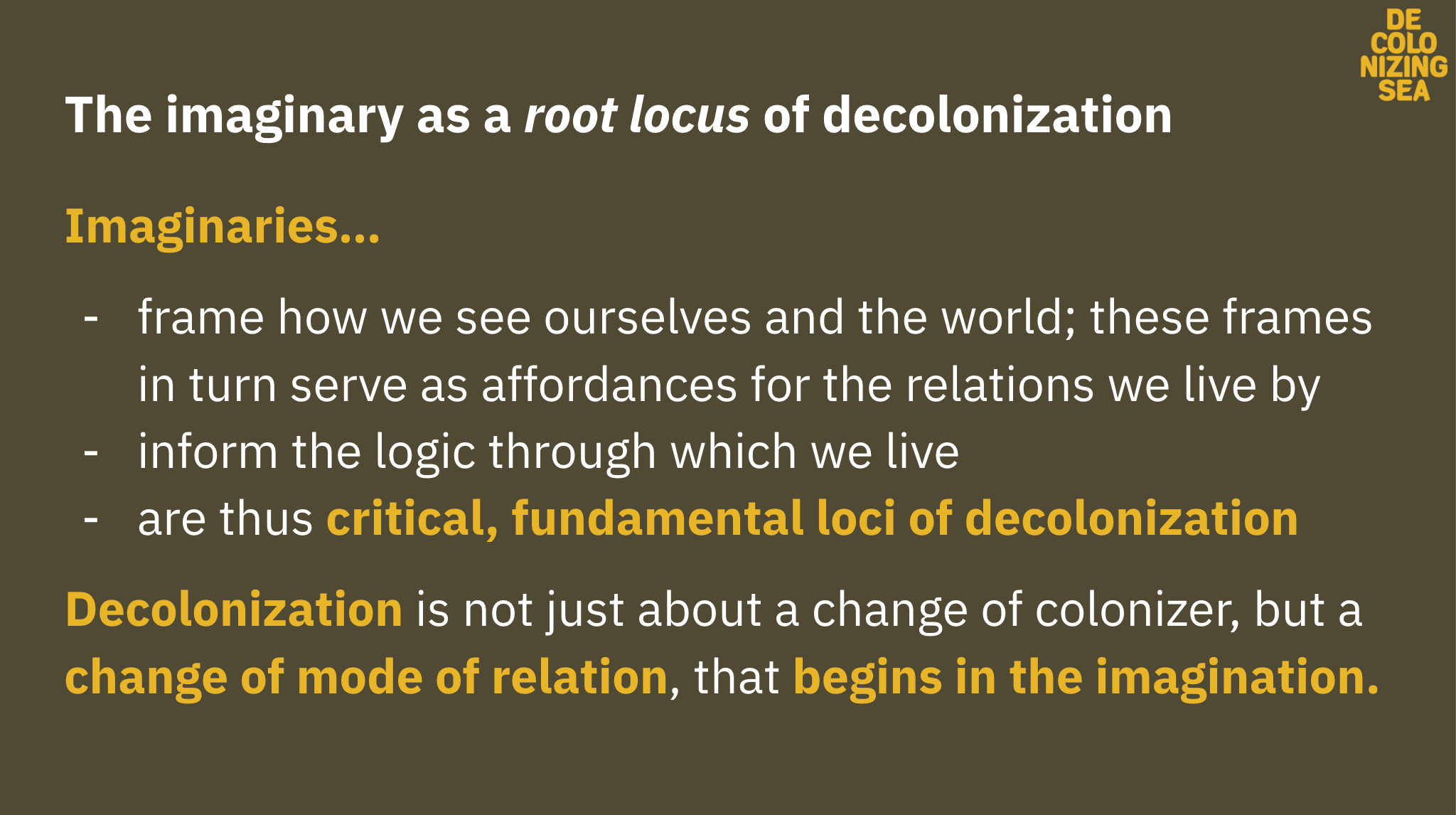Decolonization spans many loci: political, institutional, academic, economic, cultural, societal, territorial, and more. This paper suggests the realm of the âimaginaryâ as a fundamental yet underappreciated loci of decolonization, and proposes that âimaginaryâ questions of how people envision themselves, their agency, and their futures should be considered critical foremost frontiers for any serious decolonization endeavor.